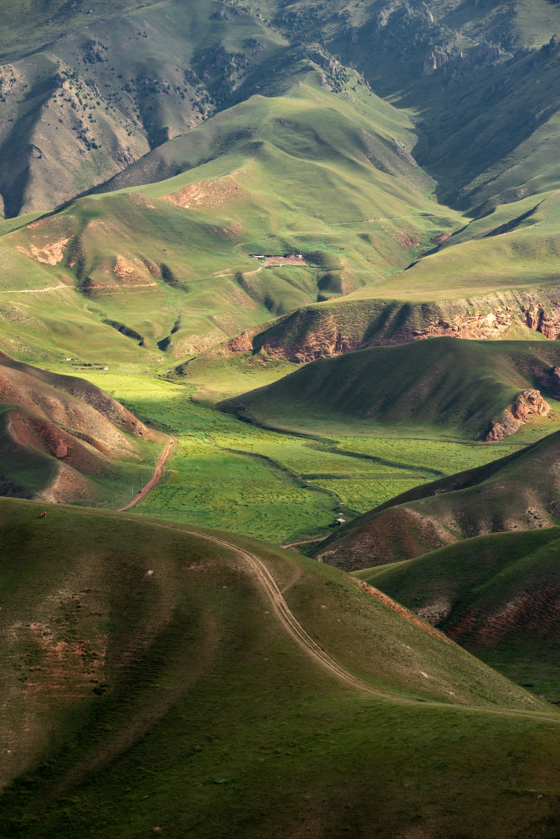 日出的光线,洒落在祁连山脉,高低起伏的山峦形成迷人的线条。